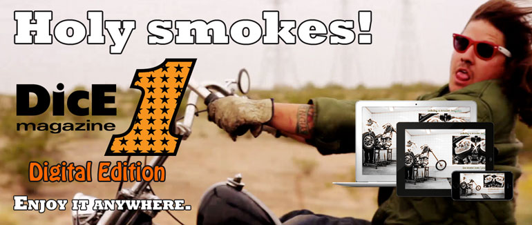 Dice Digital Issue 62 Posted by Zack Coffman on Jun 30th 2015 It was bound to happen! After eleven years, Choppertown and Dice have gotten together to release Dice Digital, the all-digital version of infamous Dice Magazine. Each digital issue will feature the same stories and gorgeous photography as the print issue, but will take readers down a rabbit hole of links, videos, and interactivity that has never been seen. We've started with Issue 62 that was launched in June and are working hard to prepare the entire Dice library for you. Have a preview of Issue 62 here and grab it today for just $5. SUBSCRIBE and SAVE Click here to subscribe to six awesome issues yearly for just $25! Issue 62 is a right little winner. Inside you will find a wonderful array of machines owned and ridden by people from around the globe. The brilliant front cover was made by the amazingly talented Mark Henning and is an homage to Robert Crumb. Remember folks.... La-La-Live Ta-Ta-Ra-Ra-Ride, Ra-Ride Ta-Ta-Ta-La-La-Live! "It's just a bike. No fancy fab-work, no uber rare parts, just something to burn a few tanks and clear your head." Texas Dennis and his 1958 HD Panhead - Portland, Oregon. Photo: Larry Niehues. "Speed week 2013 was almost a perfect week, with a top speed of almost 153 MPH and smashing 2 records. An APS-VG big twin Flathead record of 128.241 MPH was upped to 144.210 MPH. I continued gearing taller and tuning and upped an APS-VK Knucklehead record of 135.438 MPH to 151.448 MPH. I qualified for a third record but had to pull out on the back up record run due to salt clogging the main jet in one of my carburetors." Tyler malinky and his twin Triumph engined, 'Double Vision' - Hinckly, Ohio. Photo: Jon Glover. "I kind of fell into this machine and with the huge help of my close friends, what you see is what you get." Josh Barrazza and his Pan Shovel - Madison, Wisconsin. Photo: Ken Karvajal. "The best part about this show in my opinion, is that there is a little bit for everyone. From amazing flat track bikes, to Cafe Racer builds, to the Choppers we all love. It's a great mix and curated extremely well." Mike Revolt - Mama Tried, Milwaukee, Wisconsin. Photo: Mike Revolt. "Built it to race at Speed Week 2014, but it got cancelled. Maybe next year? Nah, add a taillight and call it done." Busch & Busch and their XLCH1000 - Reno, Nevada. Photo: Asa Gilmore. 7: "When 5 close friends are sitting around drinking beer and talking about everyone's bike trip plans for the year, all it takes is one to say; "We should put our own show on", to make it happen." The Giddy Up - New Braunfels, Texas. Photo: Troy Critchlow. "So we came to an agreement on the price and he tells me there is one stipulation. I couldn't pay him all at once for the bike . When I asked why, he told me it was because he would blow the money and his wife would be pissed with him." Harley Carrara and his 1947 HD Knucklehead, 'The Beatnik Dream' - Bristol, Conneticut. Photo: John A. Napierski "After a few vague emails, I met this guy in a casino parking lot. Dude had tattoos all over his head and the bike was in a pile of parts in the back of his beat up van. Sold!" Brett Beadle and his unit Triumph - Vancouver, Canada. Photo: Luke Uri. "At an early age, The Hindes brothers caught the bug to make hand crafted, American made, motorcycles and parts. In 2012 their vision became a reality and Prism Motorcycle Company opened up shop and began living out their dream." Prism Cycles - Stanley, North Carolina. Photo: Rob Lunetta. "I like to take my time and make all the small bullshit you could buy. Building a show bike is a slow arduous process, it's not really that fun as a whole." Tyler Fuzzy Bunny - Vancouver, Canada. Photo: DicE. "Then there's all these fucking goats. I quit my 14 year career of tattooing and moved out here to the hill country of Texas. I raise dairy goats and miscellaneous farming. Slower lifestyle, slower toen, but better in vitually every way for me." Lee Bullock m- Lampasas, Texas. Photo: Troy Critchlow. "This bike was originally destined to be a chopper, but it wasn't long until we figured out how much better it would look as a stripped down Cafe Racer. Frankino - Chivasso, Italy. Photo: Andrea Mazzon. The Man, The Myth, The Coolest guy on the planet. Sin Takizawa - Tokyo, Japan. Photo: DicE. "When thew owner of the truck opened up that garage, Phil saw an old Harley and knew it was right up my alley, so he asked the young man if he could take some photos of it. As soon as I saw them I knew it was a pre war Knucklehead!" Junior - LaPorte, IN. Photo: Troy Critchlow. "I think your taste in motorcycles says a lot about your taste in women. Some people like spending money on big, loud, fat, ugly things with wide back ends. Hey if you like em that way it's cool, I like my women skinny, pretty and cheap...that's why I love them diggers." Benny Thomas - Birmingham, England. Photo: Sam Christmas. Nicke Svensson and part 3 of his amazing 'The Lobster Boss' build up. Even though he broke his wrist doing a backside 180 Nosegrind, he's still moving along nicely. Photo: Boon Photography. Tokyo Street Life Photo: DicE. Drea in the desert, with no knickers on, shot by the wonderful Mandy Lyn. "Before heading back home from Salinas to Santa Ana, I called Alonzo to tell him the great news about making it and also that the bike wasn't burning oil anymore...he told me to check that it had oil in it. It was empty." Sophorn Sin - Santa Ana, California. Photo: Flyin' Dutchman. "I just love riding this bike whenever I can. It started as a rider, became a show bike and I'm proud to say it's back to being a rider.Colorado i an amazing state, the chopper scene has grown and you can't beat the scenic rides." Sean Gallager - Denver, Colorado. Photo: Travis Heacock. We asked Cole Foster 10 questions and...well..he answered them! Why subscribe? Apart from the $5 savings (basically one issue FREE) Subscribers will receive their digital copy 2 weeks before th